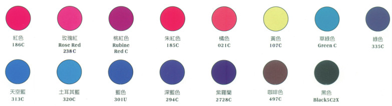 C.基本顏色:各溫度可提供15色(70°C僅提供黑色及深藍(lán)色),各色可互相混合,亦可添加其他色料調(diào)色。(以下顏色為印刷色,以實際材料為準(zhǔn),顏色近似于PANTONE色號標(biāo)示。)